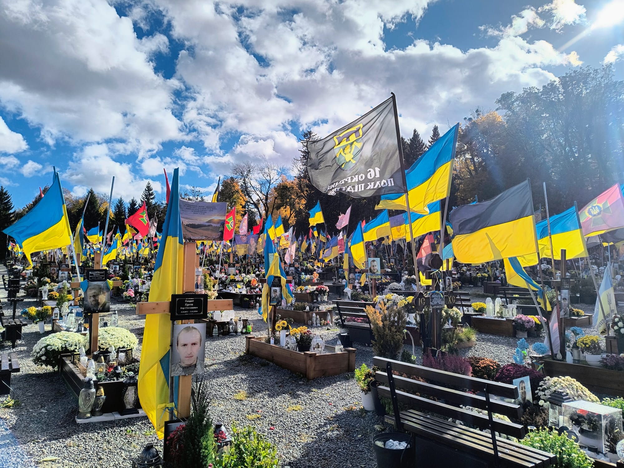 Ráno usedáme nad výborným brunchem v jedné z nekonečně mnoha lvovských kaváren a celá noční situace se zdá být jen sen nebo noční žert. Že to nebyl sen ani špatný vtip si připomeneme hned záhy. Jako první se jdeme podívat, jak se pletou ochranné sítě proti ruským dronům, a pod vedením místních dobrovolníků taky přikládáme ruku k dílu. Klíčem je hlavně nedělat pravidelné vzory! Nevěřili byste, jak nepřirozené to pro lidský mozek je… A hned vzápětí přichází ten nejsilnější moment celé cesty. Navštěvujeme místní vojenský hřbitov. Rozlehlá plocha přiléhající ke starému hřbitovu je lemována dlouhými řadami hrobů mužů a žen, kteří padli v boji za svobodnou Ukrajinu. Ve větru se pnou hrdě vlající prapory ukrajinského státu i jednotlivých brigád. A vy zkroušeně procházíte kolem nich a přemýšlíte…